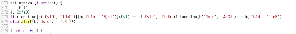다시 if문으로 돌아와서, 조건이 성립하면(if문) location을 변경해주고, 성립하지 않으면(else문) alert를 실행하게 되어있다. 즉, 조건이 성립하면 페이지 주소(location)을 b('0x1d', 'llaF')로 변경하라는 의미이다.