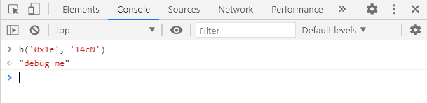 처음 "debug me" 메세지가 뜬 이유는 아마 코드에서 alert 함수를 사용했기 때문이라고 생각해, Ctrl+f 를 통해 'alert'를 검색해주었더니 if문이 하나 나왔다. 하지만 alert(b('0x1e','14cN'))이 무슨 의미인지 파악하기가 쉽지 않아 페이지에서 콘솔창을 이용했다.
